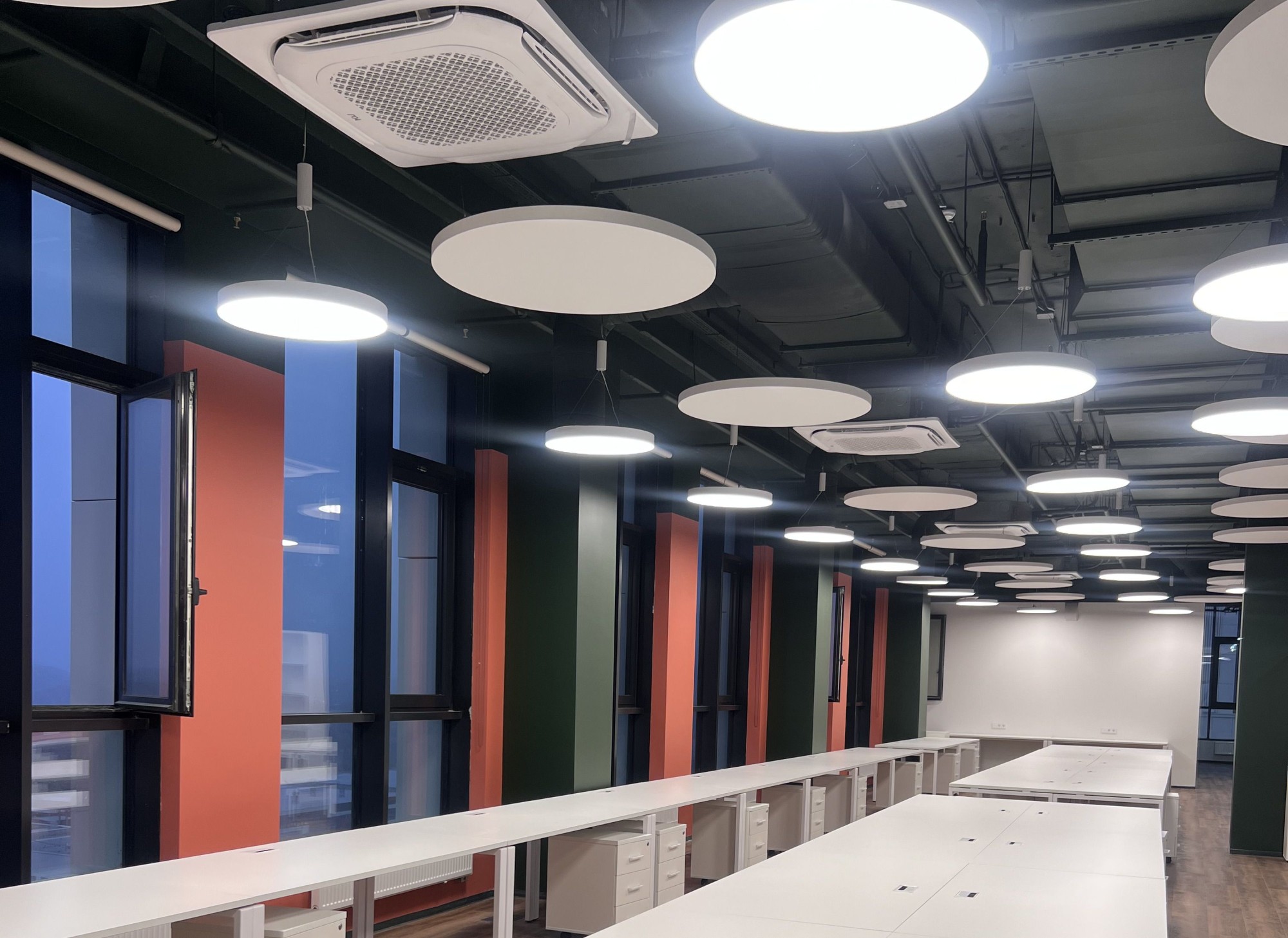 Для проекта были выбраны круглые острова акустических панелей K&R Design. Они не только решают задачу звукоизоляции, но и становятся выразительным элементом современного интерьера. Круглая форма панелей обеспечивает равномерное распределение звуковых волн и создаёт визуальную динамику пространства.