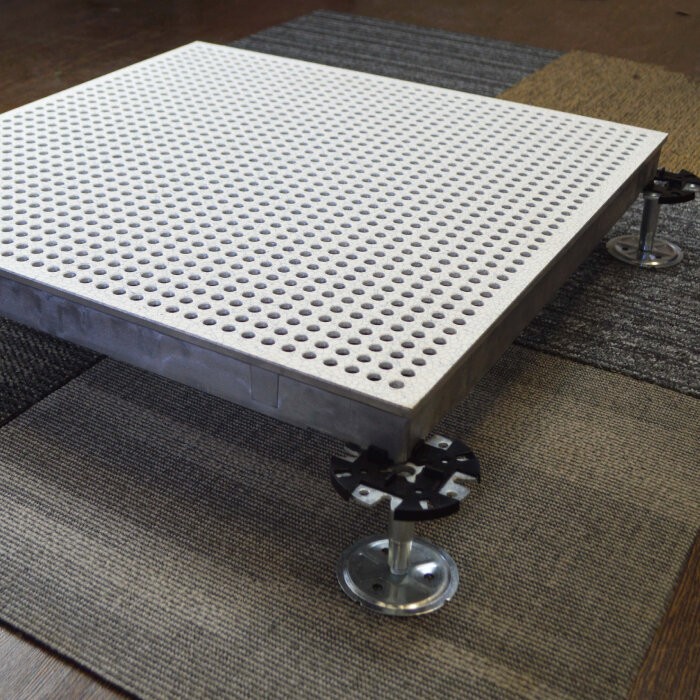 - Перфорированные панели — с отверстиями, обеспечивающими циркуляцию воздуха. Процент перфорации может составлять 10–28%, а в специальных исполнениях достигать 55%. Это позволяет использовать фальшпол как элемент системы вентиляции и охлаждения.