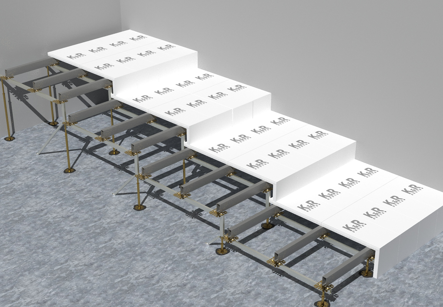 Стойки позволяют точно выставить высоту конструкции и организовать пространство для инженерных коммуникаций, а плиты формируют прочную, негорючую и бесшовную поверхность с нитевидными стыками. Такое решение является эффективной альтернативой бетонной стяжке, имеет малый вес и выдерживает нагрузки до 10 тонн на м². Использование возможно уже через сутки после монтажа.