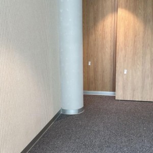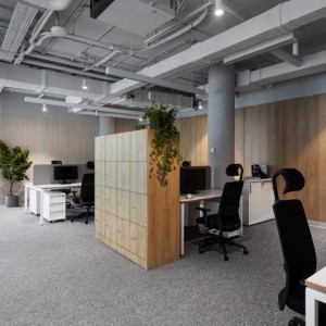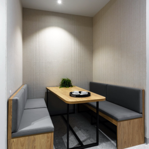 Панели изготовлены специально под проект с разными размерами из войлока — плотного и экологичного материала, обладающего высокими звукопоглощающими свойствами толщиной 9 мм. Благодаря V-образным пазам на поверхности создаётся эффект объёмности, а сама стена приобретает динамичный и современный вид.