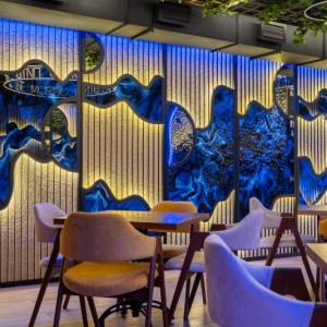 Наша компания K&R Design выполнила все работы, связанные с отделкой потолков и стен панелями из нержавеющей стали с эффектом водной ряби в двух цветах: серебряный и золотой.
