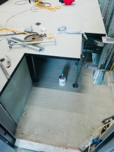 Сложное техническое помещение с развитой системой коммуникаций. Монтаж усложнялся тем, что нужно было совместить схему прокладки коммуникаций с сеткой фальшпола. В карусели видно как много проводов и коммуникаций можно скрыть под системой фальшпола.