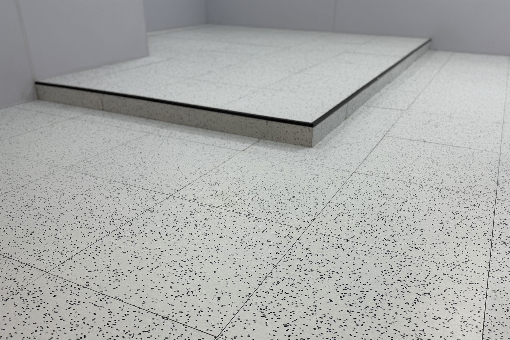 Антистатические напольные покрытия применены в операторских пультах управления и отдельных переговорных. Их основная задача — защита оборудования и персонала от статического электричества. Важный акцент — аккуратные переходы между антистатиком и другими покрытиями (ковровая плитка, подиум) на одном уровне.