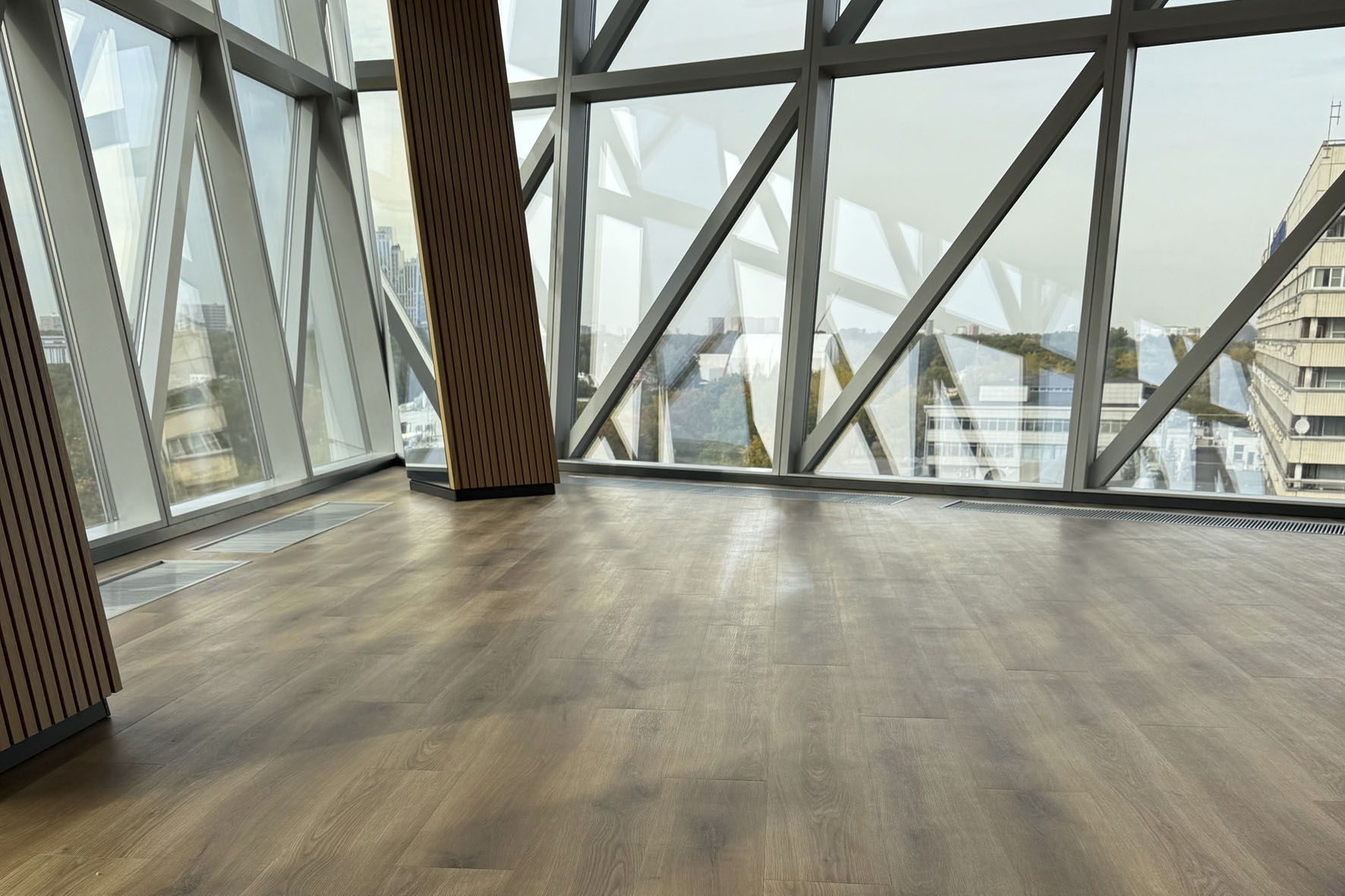В некоторых кабинетах заказчик выбрал LVT (ПВХ) плитку в рабочих зонах, а ковровая плитка осталась в холлах. Хотя стандартная практика часто обратная, такое решение оправдано с точки зрения практичности и дизайна.