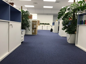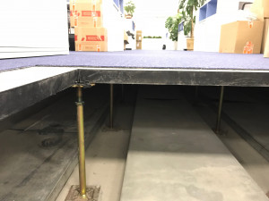 Черновой пол в помещении был разноуровневым, поэтому стойки фальшпола разной высоты. Также в офсие были установлены пандусы