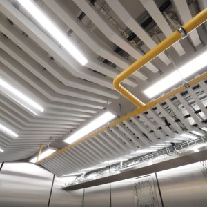 В рамках проекта был реализован кубообразный металлический потолок сложной формы с интегрированными линейными светильниками, изготовленными под заказ. Такое решение обеспечило равномерное освещение и подчёркнуло геометрию пространства.